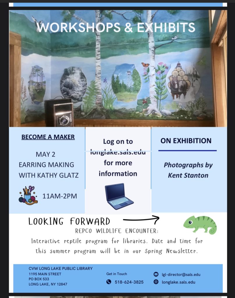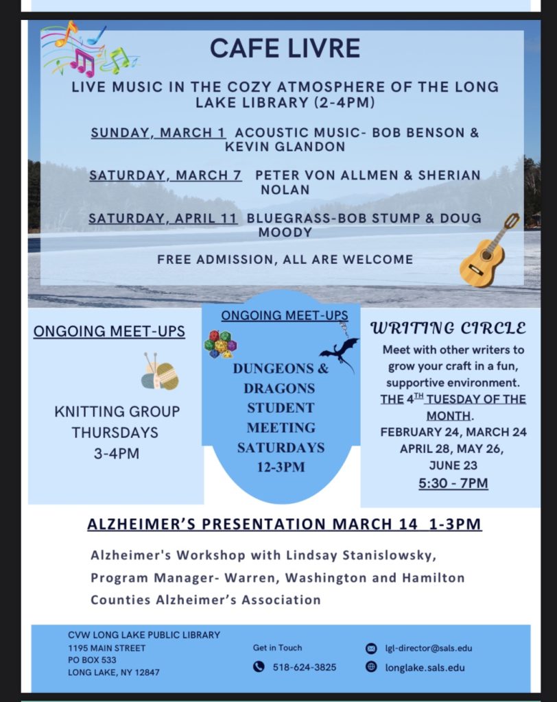 Included in the newsletter are upcoming workshops, events, and live music performances as well as library resources (in-house and online).